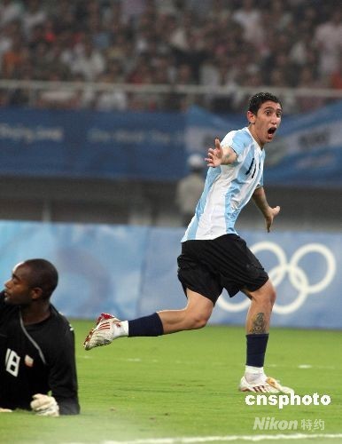 图为为阿根廷打入制胜球的11号安吉尔·迪·马里亚(DI MARIA Angel)庆祝胜利。