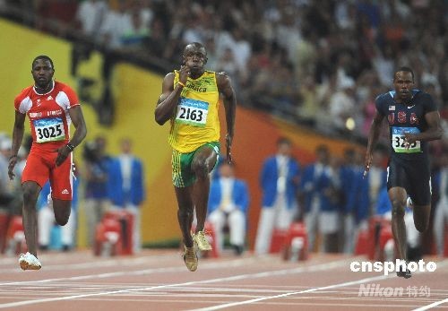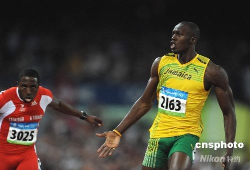 8月16日晚,牙买加选手尤塞恩·博尔特在中国国家体育场“鸟巢”进行的北京2008年第二十九届奥运会男子100米决赛中,以9秒69的成绩夺得金牌并打破9秒72的世界纪录。中新社发 古玉 摄