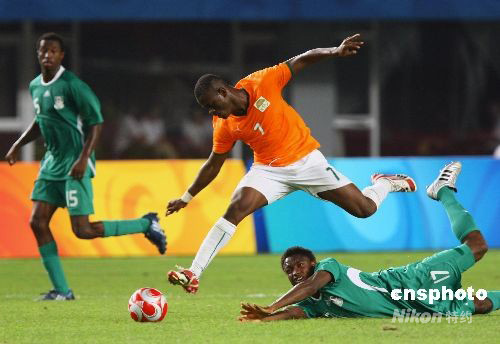 8月16日晚,北京奥运会男子足球1/4决赛,尼日利亚(绿)对阵科特迪瓦比赛在秦皇岛奥体中心举行,最终尼日利亚2:0胜科特迪瓦,挺进四强。中新社发 刘新 摄