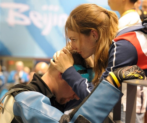 失落的埃蒙斯走到妻子的面前,这位射落本届奥运会首金的捷克女神枪手,捧起丈夫的脸,轻轻地摩挲,用深情的注视和呢喃来安慰他……,就像卡特琳娜夺金之后与丈夫深情一吻一样,这一刻也给观众留下了深刻而温馨的印象。