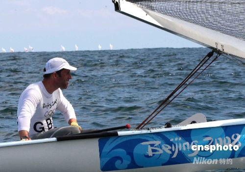 8月17日,北京奥运帆船比赛在青岛分赛场举行奖牌轮较量,来自英国的本·安斯利获得重量级艇-芬兰人级比赛冠军。 中新社发 赵振清 摄