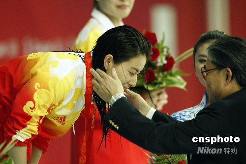 8月17日,中国选手郭晶晶获得女子3米板跳水冠军,霍震霆为郭晶晶颁发金牌。中新社发 杜洋 摄
