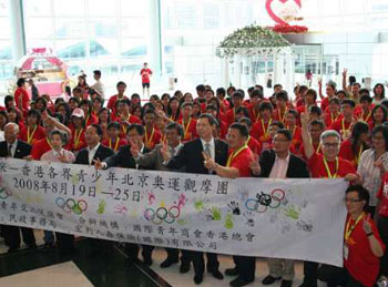 100名青少年19日汇集红磡都会广场,举行“为奥运喝彩─香港各界青少年北京奥运观摩团”出发礼。他们19日搭乘火车出发,准备亲身感受热烈的奥运气氛和观看部分决赛项目,以及为祖国和香港运动健儿加油。