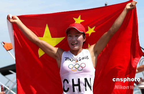 8月20日,北京2008奥运帆板比赛在青岛分赛场举行,中国四川姑娘殷剑夺得女子帆板冠军,这也是中国代表团在奥运会历史上取得的第一枚帆船项目的金牌。中新社发 赵振清 摄