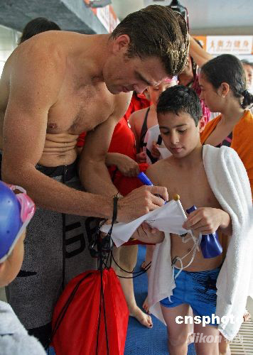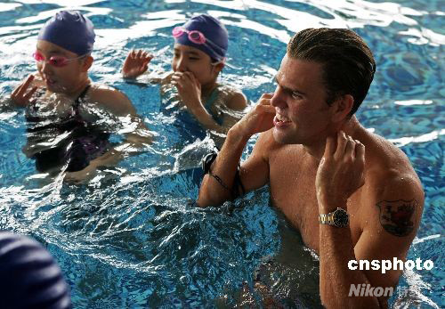 8月20日,美国前奥运冠军、10枚奥运奖牌获得者加里·霍尔,作为糖尿病关爱大使,来为北京的孩子们传授游泳技能,并且激励糖尿病儿童重获生活信心。加里·霍尔在身患糖尿病而且被医生断言无法再参加比赛后,又在2000年悉尼奥运会、2004年雅典奥运会上夺得了3枚奥运金牌。 中新社发 赵隽 摄