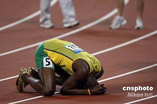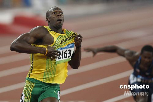 8月20日晚,即将于8月21日迎来22岁生日的牙买加选手尤塞恩·博尔特,在国家体育场“鸟巢”再造神话,在北京奥运会男子200米决赛中,以19秒30获得金牌,并打破约翰逊保持12年之久的19秒32的世界纪录。这是继博尔特16日晚以9秒69打破男子100米世界纪录后,再一次在“鸟巢”创造奇迹。中新社发 盛佳鹏 摄