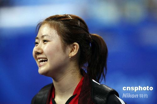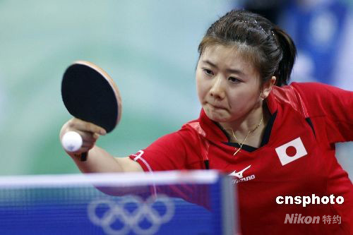 8月21日,北京奥运会乒乓球女子单打第四轮的比赛在北京大学体育馆进行,日本选手福原爱不敌中国选手张怡宁遭淘汰。 中新社发 盛佳鹏 摄