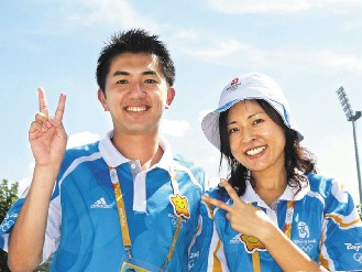 来自台湾的七十四名志愿者,在五棵松棒球场上有近20人,他们多半负责球场上观众导引、维持一般秩序等工作。