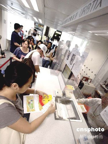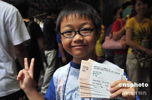 八月二十一日,中国奥运金牌精英访港表演门票开始发售,香港市民通宵在售票点排队购票。入场票在今早十时开始发售,图为市民踊跃购买。