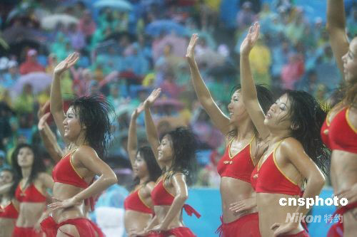 8月21日,中国选手田佳、王洁在奥运沙滩排球决赛中以0 :2负于美国选手克丽·沃尔什、米丝蒂·梅—特雷纳,获得亚军。比赛在大雨中进行,沙滩排球宝贝在雨中劲舞。中新社发 武仲林 摄