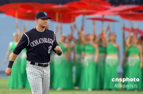 当地时间八月二十日晚,美国职业棒球大联盟洛杉矶道奇队在主场迎战科罗拉多洛基山队。该场比赛被定为“美国华人社区之夜”。比赛开始前,北京奥运会吉祥物“福娃”亮相棒球场,庆祝北京奥运会成功举办。洛杉矶华人社团——美中文化协会艺术团表演的雨伞舞、折扇舞及腰鼓表演赢得观众阵阵掌声。 中新社发 张炜 摄