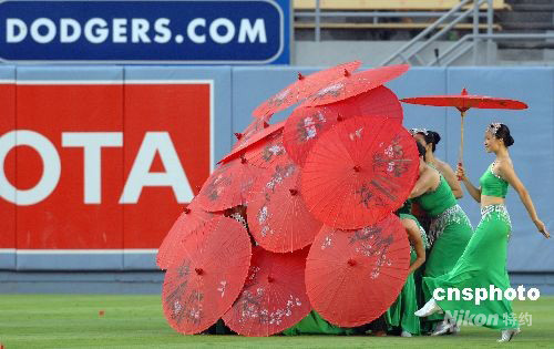 图:中国红伞舞为美国棒球联赛助兴