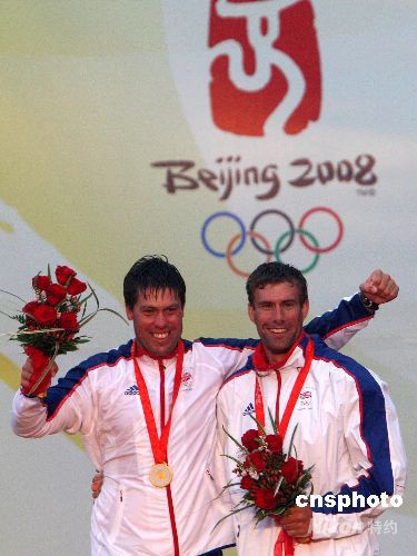 8月21日,北京奥运会帆船男子龙骨艇—星级奖牌轮比赛在青岛举行,英国选手伊恩·珀西/安德鲁·辛普森获得冠军。 中新社发 赵振清 摄