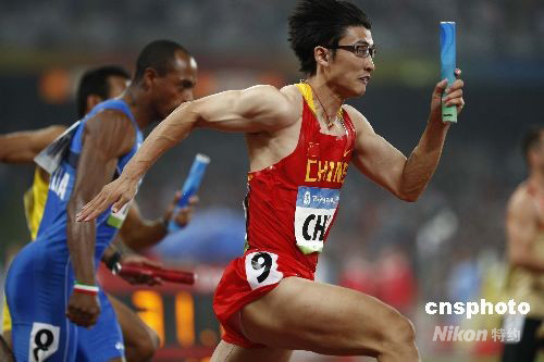 8月21日,北京奥运会男子4x100米接力第1轮-第2组比赛中,中国队跑出39.13秒,晋级决赛。图为中国队胡凯在比赛中。 中新社发 盛佳鹏 摄