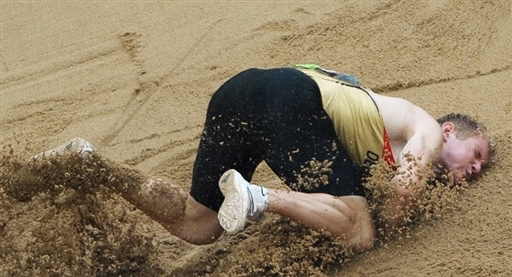 8月21日,一位选手在奥运会男子三级跳的比赛中动作失误,跌落沙坑。