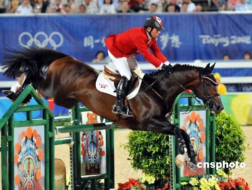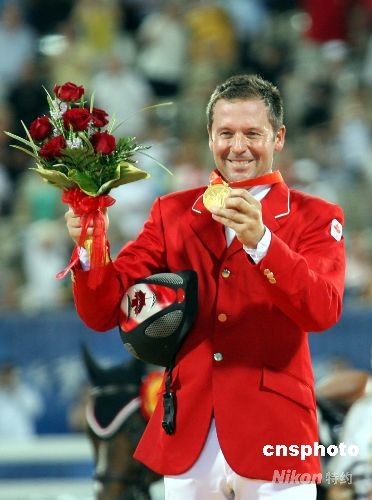 八月二十一日晚,奥运马术在香港沙田赛场举行场地障碍个人赛决赛。加拿大选手埃里克·拉马兹策骑马匹“希克斯特德”赢得金牌。中新社发 邓庆乐 摄