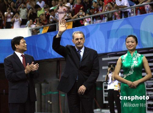 8月22日上午,国际奥委会主席罗格、北京奥组委主席刘淇,到北京奥林匹克体育中心体育馆观看北京2008武术比赛,并为女子剑术项目颁奖。中新社发 宋吉河 摄