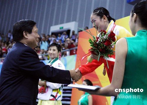 刘淇为北京2008武术比赛女子剑术金牌得主中国运动员马灵娟颁奖。