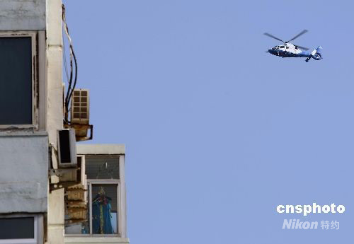 8月24日上午,直升机在北京中关村上空盘旋,实时直播男子马拉松赛事。当天7时30分,北京奥运会田径比赛传统压轴大戏——男子马拉松比赛正式开跑,赛程42.195公里,终点为国家体育场“鸟巢”。中新社发 刘新 摄