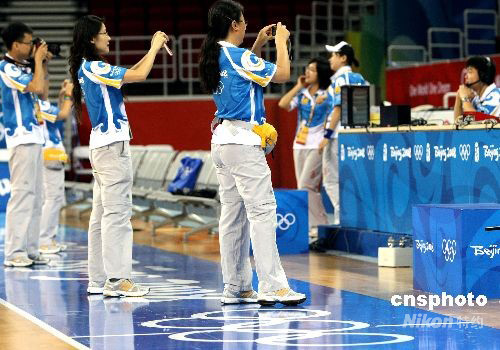 8月24日,北京奥运会闭幕日,在北京五棵松篮球馆服务了1个多月的大学生志愿者们,清晨到篮球场内拍摄珍贵的留念照。北京奥运会的赛会志愿者大多数是北京地区的在校大学生,他们的整体服务受到与会者的高度评价。中新社发 任晨鸣 摄