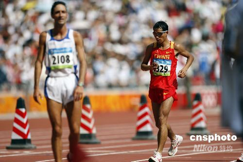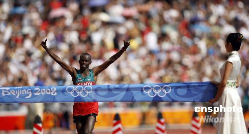 8月24日,北京奥运会田径比赛的最后一天,在男子马拉松的比赛中,肯尼亚选手塞缪尔-卡马乌以2小时06分32秒夺冠,并且打破了奥运会纪录。银牌被摩洛哥选手贾瓦德-加里卜以2小时07分16秒夺得,同样打破了奥运会纪录,第三名被埃塞俄比亚的策加耶-凯贝德-沃尔多法以2小时10分00秒获得。中国选手邓海洋和李柱宏以2小时16分17秒和2小时24分08秒分列第25位和51位。中新社发 盛佳鹏 摄