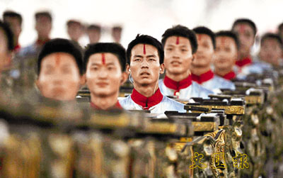 彩排时,知道演员所各自担任的角色要求后,师生们又为“缶阵”2008名演员重新设计发型:两侧修剪为边缘层次型,头顶修剪为均等层次型,略带方角,线条流畅精练,充分表现出男子的简洁、率真、坚定和正直气概;额上一竖红直透眉心,借鉴了京剧面谱的创意,充分体现了“缶阵”的王者之气、仁义之师、礼仪之邦的气势,中华文化“君子义以为质”的优良传统。(林赛香、王文)