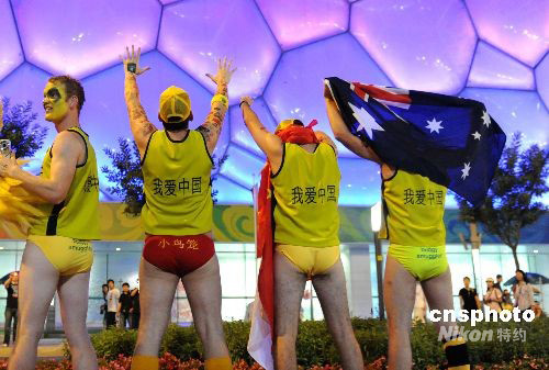 北京奥运会进入尾声,奥林匹克公园里的人流不减,几位澳大利亚游客在“水立方”前挥舞本国国旗,衣上大书“我爱中国”。中新社发 廖攀 摄