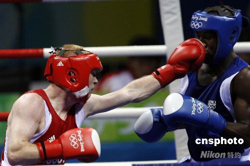8月24日,在北京奥运会拳击比赛男子轻量级(60公斤级)决赛中,俄罗斯选手阿列克谢·季先科(红)战胜法国选手达乌达·索夫赢得冠军。 中新社发 盛佳鹏 摄