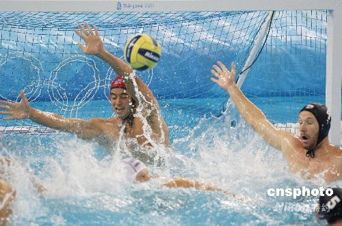 8月24日,卫冕冠军匈牙利队在北京奥运会男子水球决赛中以14:10战胜美国队,获得金牌,实现三连冠。图为匈牙利队射门得分。中新社发 武仲林 摄