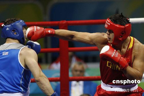 8月24日,北京奥运会最后一天,下午在北京工人体育馆举行的拳击男子超重量级(91公斤以上级)总决赛中,中国选手张志磊(红)以4-14不敌意大利人罗伯托·卡马雷莱获得银牌,为中国代表团夺得本届奥运会第100枚奖牌。至此,中国代表团在本届奥运会的比赛全部完成,共获得51枚金牌和100枚金牌,在金牌榜上名列第一,创造了参加历届奥运会的最好成绩。 中新社发 盛佳鹏 摄