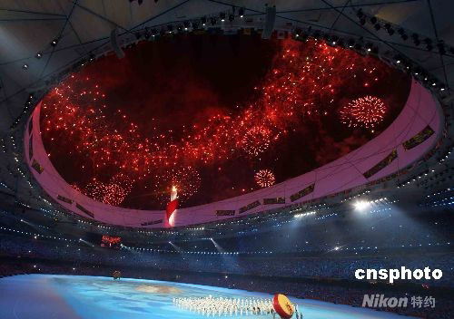 图:北京奥运会闭幕式开始 烟花映照“鸟巢”