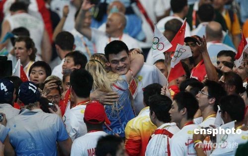 图:奥运会闭幕式姚明友好拥抱金发美女