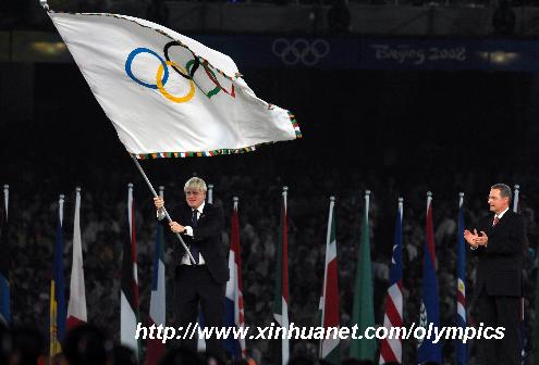 8月24日晚,第29届夏季奥林匹克运动会闭幕式在北京国家体育场——“鸟巢”举行。这是伦敦市市长约翰逊(左)手举奥林匹克会旗。 新华社记者王雷摄