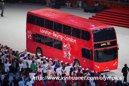 北京奥运会闭幕式举行 8月24日晚,第29届夏季奥林匹克运动会闭幕式在北京国家体育场——“鸟巢”举行。这是伦敦巴士开进会场。 新华社记者郭大岳摄