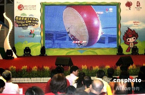 八月二十四日晚,香港市民正在香港奥运文化广场观看北京奥运闭幕式直播。中新社发 张勤 摄