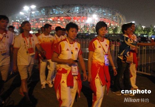 8月24日晚,蝉联奥运乒乓球女子单打冠军的张怡宁(右)与队友郭跃,在北京奥运会闭幕式结束后走出鸟巢。中新社发 杜洋 摄