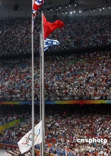 8月24日晚,北京奥运会闭幕式在奥林匹克公园内的国家体育场举行,奥林匹克会旗徐徐降下。 中新社发 任晨鸣 摄