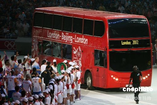 8月24日晚,北京奥运会闭幕式在奥林匹克公园内的国家体育场举行,下届奥运会主办城市伦敦市上演“伦敦8分钟”演出,一辆伦敦标志性的双层红色巴士驶入“鸟巢”体育场。中新社发 任晨鸣 摄