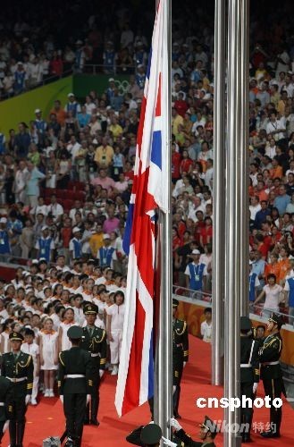 8月24日晚,第29届夏季奥运会在国家体育场“鸟巢”闭幕。下届奥运会主办国英国的国旗在会场中升起。中新社发 任晨鸣 摄