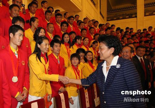 8月26日,2008年北京奥运会中国体育代表团总结大会在北京人民大会堂金色大厅举行。中共中央政治局委员、国务委员、北京奥组委副主席刘延东出席大会并与运动员握手致意、合影留念。 中新社发 廖文静 摄