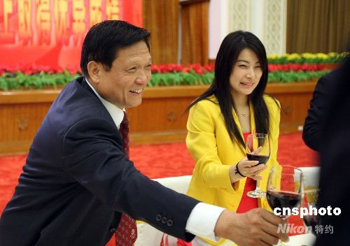8月26日,2008年北京奥运会中国体育代表团总结大会在北京人民大会堂举行。中共中央政治局委员、北京市委书记、北京奥组委主席刘淇向北京奥运会中国体育代表团敬酒致意。
