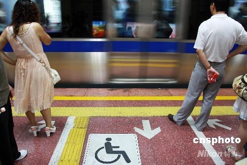 8月27日,一种白色无障碍标识开始在北京地铁1号、2号线各站台出现,使北京地铁无障碍设施进一步得到完善,迎接即将到来的残奥会。图为北京地铁2号线阜成门站台的白色无障碍标识。中新社发 郑雄增 摄