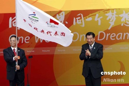 8月30日,北京残奥会中国体育代表团在残奥村升旗广场隆重举行誓师动员大会。中共中央政治局委员、国务院副总理、国务院残疾人工作委员会主任回良玉(右)出席会议并向北京残奥会中国体育代表团团长王新宪授旗。中新社发 杜洋 摄