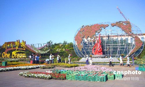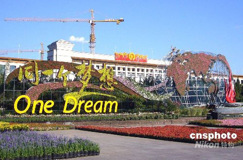 图:天安门广场残奥花坛摆放进入收尾阶段