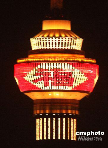 高达405米的北京中央电视塔9月2日晚将巨大的“福” 字点亮,迎接2008北京残奥会的召开。中新社发 赵振清 摄
