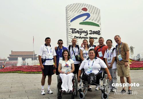 9月3日,罗马尼亚残奥会运动员在志愿者的陪同下来到天安门广场参观游览,体验北京残奥会气氛和热情友好的北京,并在残奥会会徽“天地人”前合影留念。 中新社发 王宇婷 摄