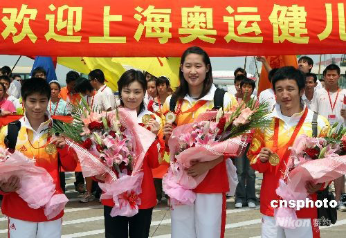 9月3日,在北京奥运会上获得金牌的上海籍运动员、教练员载誉回沪,奥运健儿们在机场受到了上海市民的热情欢迎。图为左起获得男子双人十米跳台冠军的火亮、女子双人3米板跳水冠军的吴敏霞、女子200米蝶泳金牌的刘子歌、男子拳击48公斤级冠军的邹市明在机场合影。 中新社发 汤彦俊 摄
