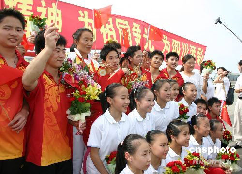 9月3日15时30分,北京奥运会冠军邹凯、殷剑在家乡人民的热烈欢迎中回到了四川。在2008北京奥运会上,来自四川泸州的邹凯勇夺自由体操、单杠、男子体操团体三枚金牌,来自凉山的殷剑为中国代表团拿下了第一枚奥运会帆船金牌。中新社发 霍潺 摄