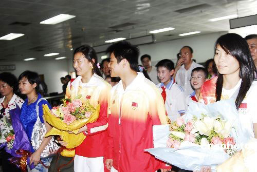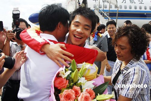 9月4日,刚参加完第29届奥运会广东省总结表彰会的湛江籍奥运冠军何冲等飞抵湛江,受到湛江市政府和父老乡亲的热烈欢迎。当日上午,何冲母校——湛江市第四小学、赤坎区业余体育学师生代表和他的亲朋好友,到湛江机场迎接何冲的归来。同期抵湛江的还有湛江籍北京奥运季军、国家花样游泳队队员刘鸥,国家女足运动员谢彩霞以及湛江籍运动健儿张小冬和上届奥运冠军劳丽诗等,他们于当天下午参加了湛江市的庆功表彰大会,湛江市授予何冲湛江市劳动模范称号;湛江市总工会授予刘鸥和谢彩霞“五一劳动奖章”称号;共青团湛江市委授予刘鸥“湛江市模范共青团员”称号,谢彩霞“湛江市模范青年岗位能手”称号;湛江市妇联授予刘鸥和谢彩霞“三八红旗手”称号。中新社发 李满青 摄