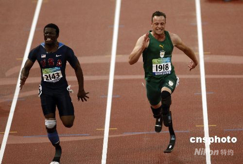 9月9日,北京残奥会男子100米-T44决赛中,被称为“刀锋战士”的南非选手皮斯特瑞斯以11秒17的成绩摘得金牌。 中新社发 杜洋 摄